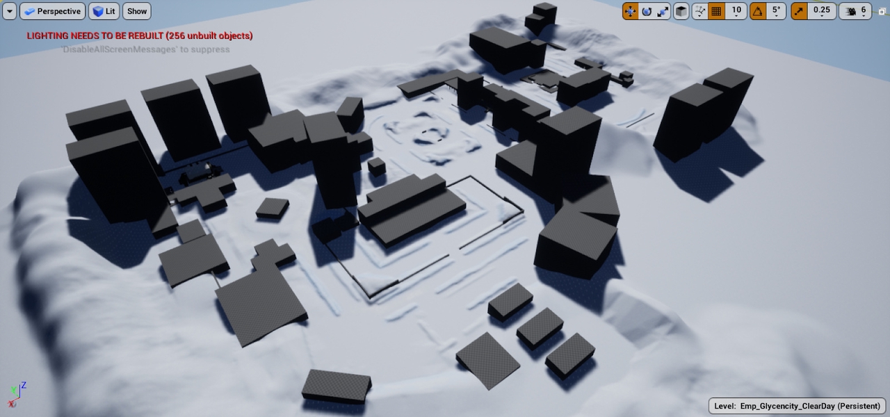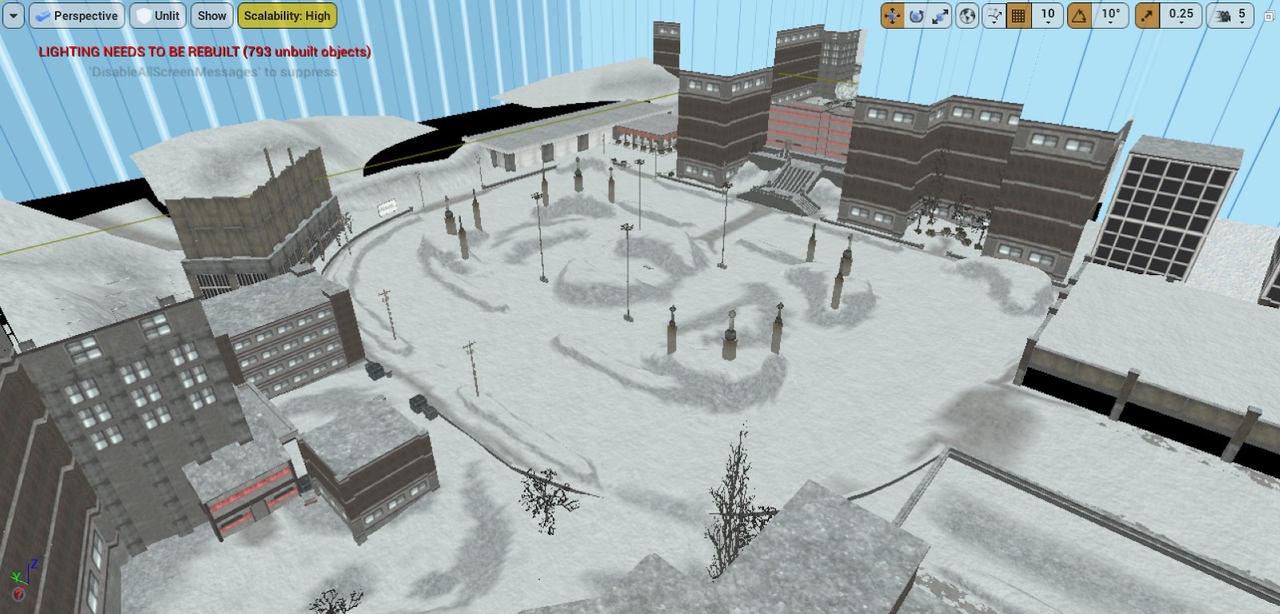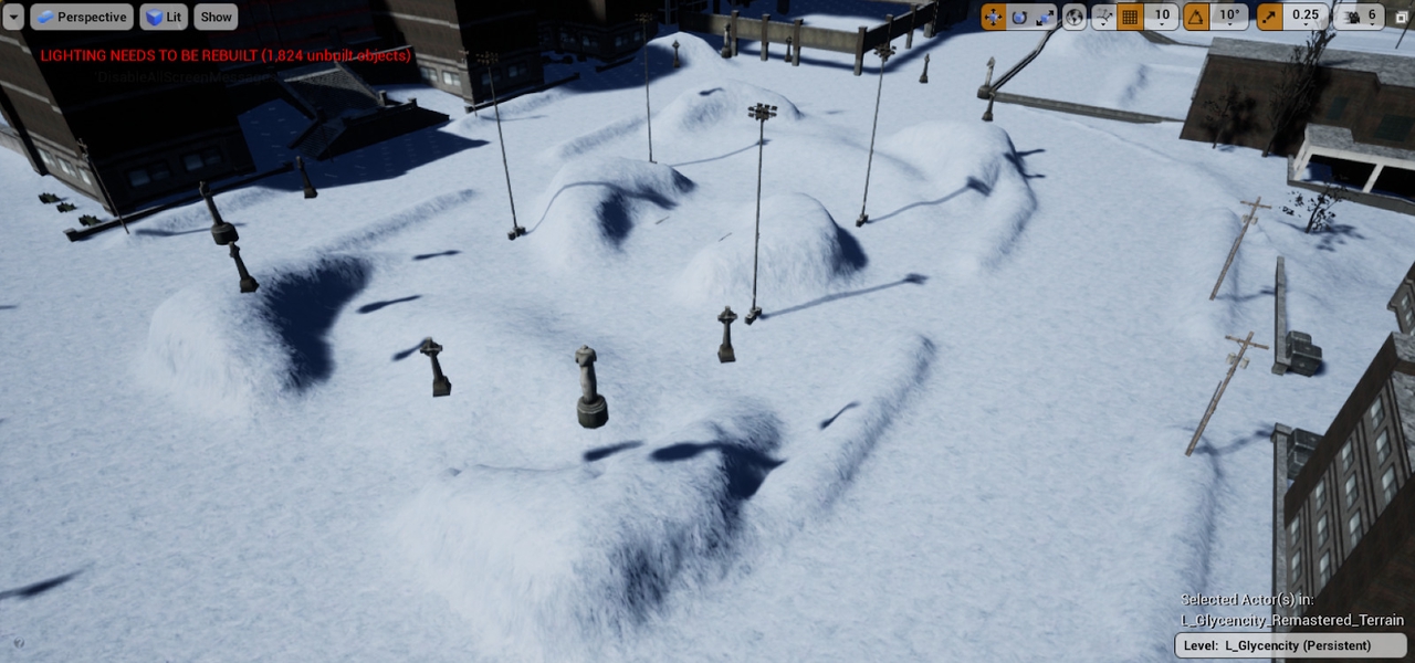 I’ve been working on porting/remastering glycencity from sourcepires. I like the idea and aesthetic of a snowed-in city/town. There are also interesting potential gameplay implications to explore later down the line, like dense snowfall that limits visibility, flashlights / headlights illuminating snowfall and giving away positions etc. For now I will be remaining faithful to the original, in the spirit of the unrealpires project.