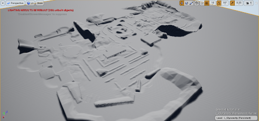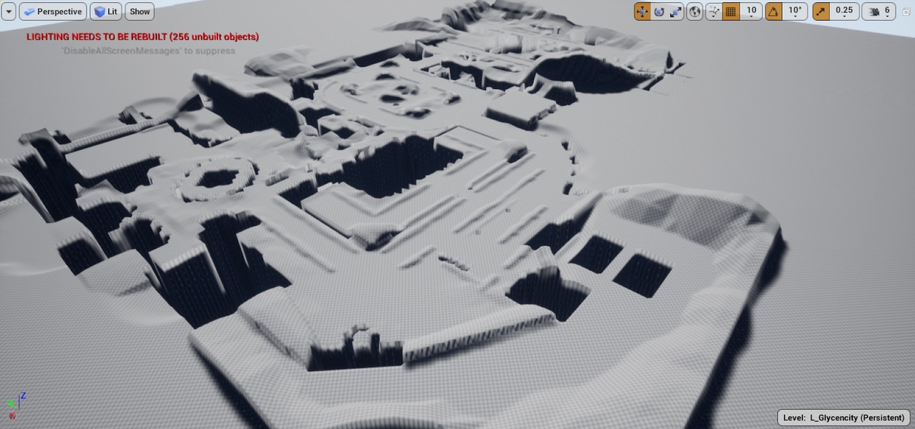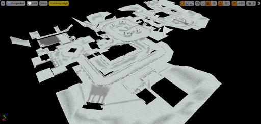 Most of the map’s terrain consists of displacements, with the buildings being made out of brushes. Terrain in UE4 is best achieved using landscapes, so I set out to convert the displacements to a single large landscape. Here you can see the imported map with only displacement geometry.
