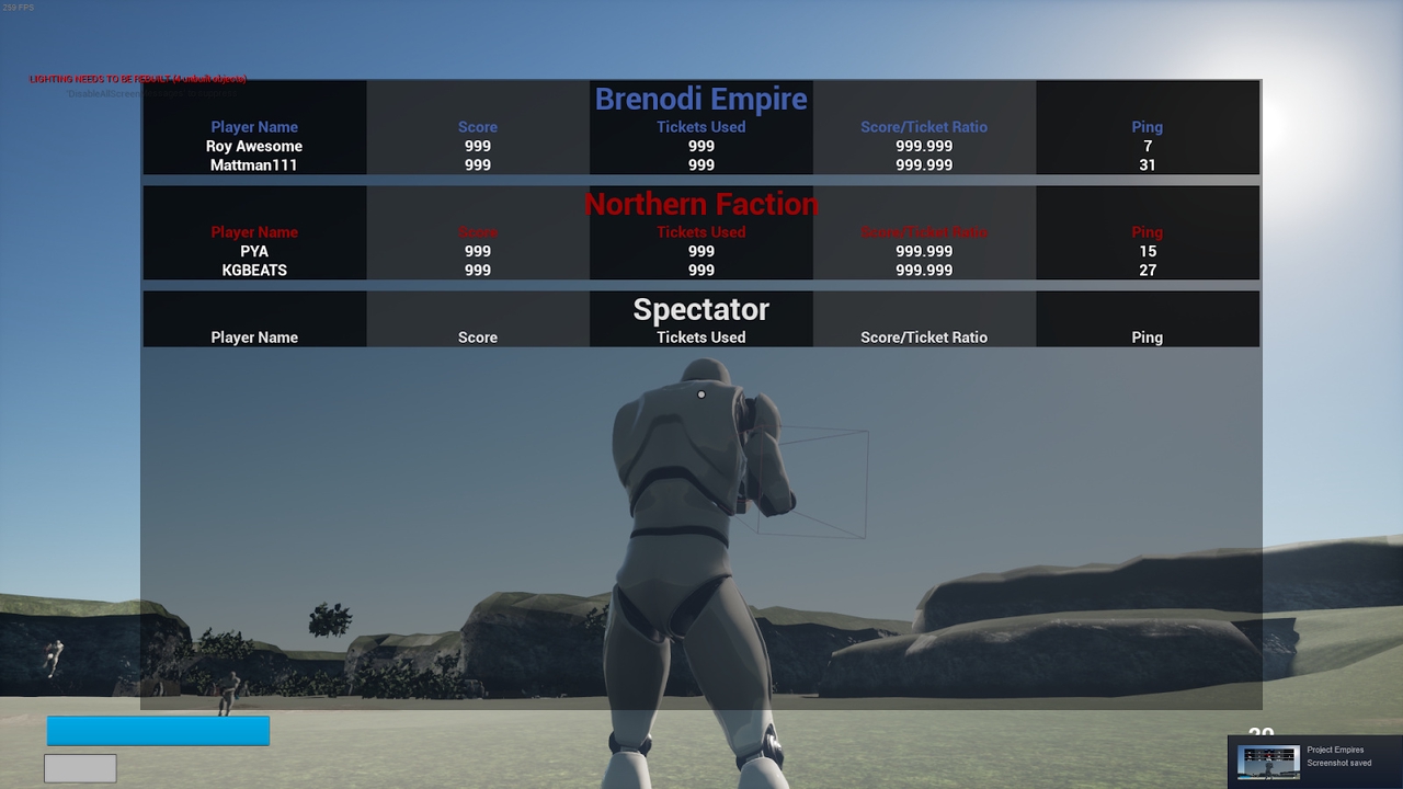 Outside of that, I got a Scoreboard working. I’m experimenting with the design a bit, and would like to hear all of your feedback. I removed “Kills” and “Deaths” and instead am using “Score” and “Tickets Used”. Kills is an interesting metric for Empires, but it doesn’t quite convey all the things that are good to do in Empires. Healing, Building, dealing damage… These are all actions that generate Score, and the highest Scoring player is often the best even if they aren’t getting a lot of kills. Changing death to Tickets Used is just a really obvious change, as if you are revived your death doesn’t really matter.